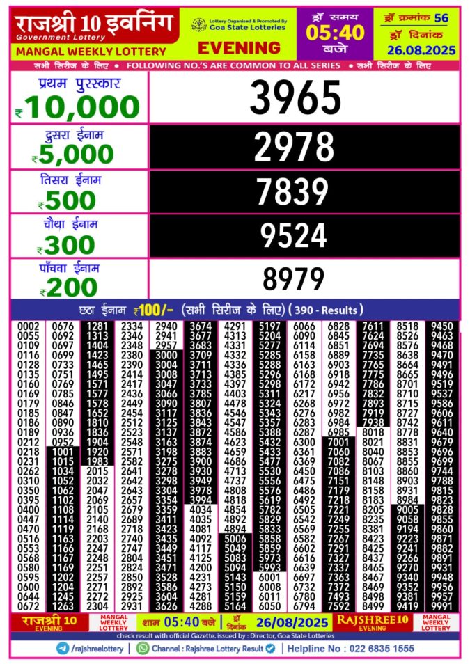 Rajshree 10 Evening Mangal 5.40pm Weekly Lottery Result 26/08/2025
