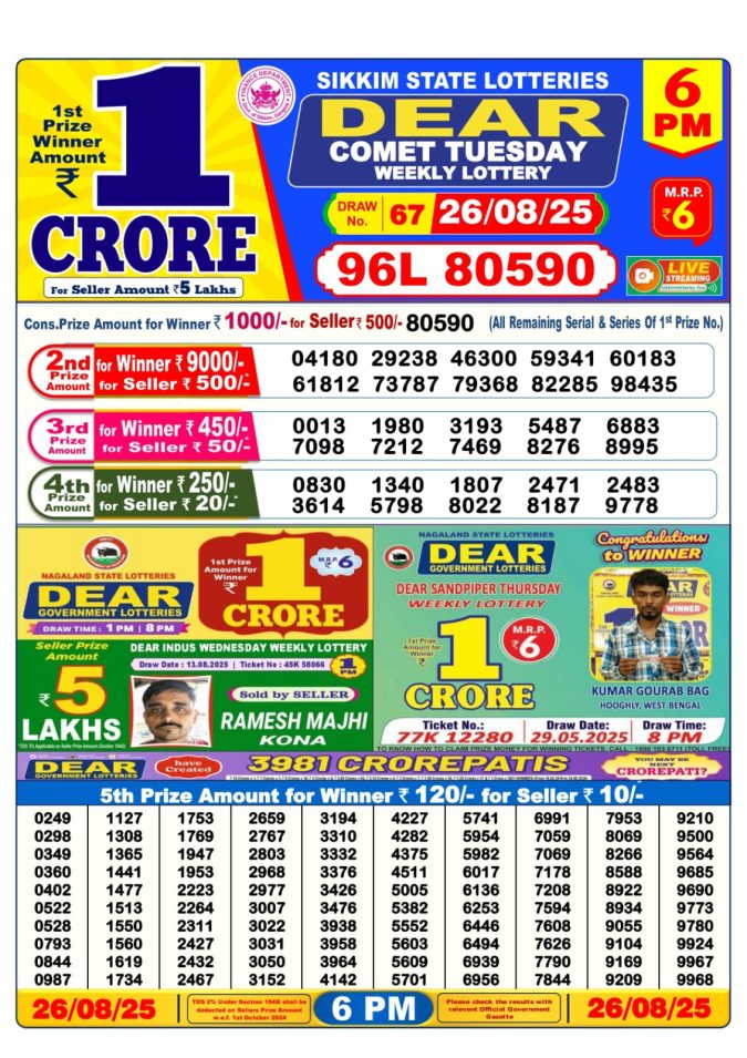 Dear Comet 6pm Tuesday Weekly Lottery Result 26/08/2025