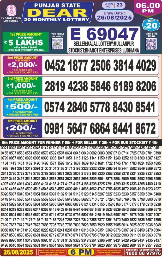 Punjab State Dear 20 Monthly lottery result 26/08/2025