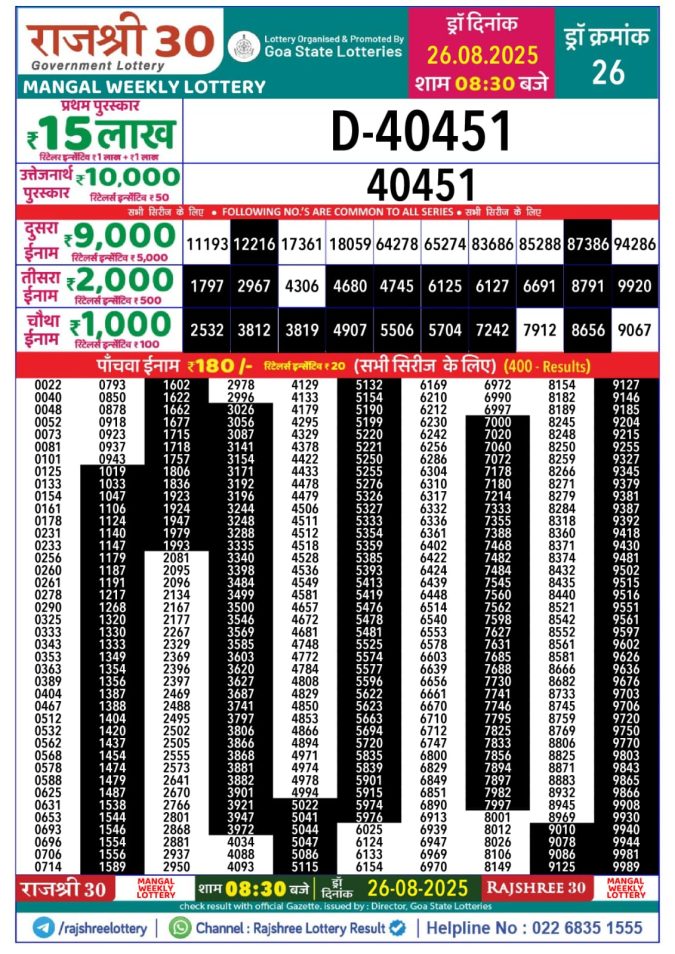 Rajshree 30 Mangal Weekly Lottery Result 8.30pm 26/08/2025