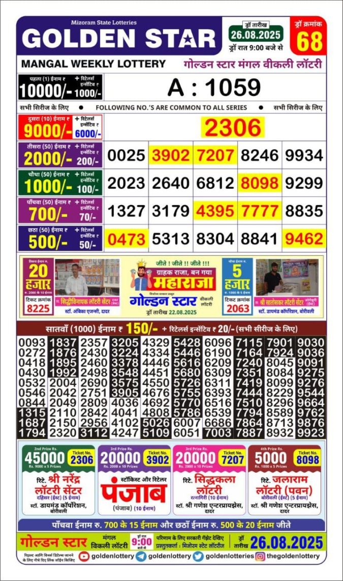 Golden Star 9 PM Weekly Lottery Result 26/08/2025