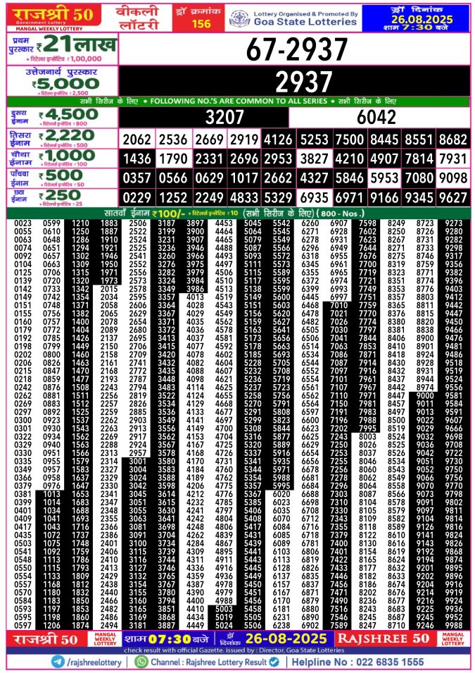 Rajshree 50 Mangal 7.30pm Weekly Lottery Result 26/08/2025