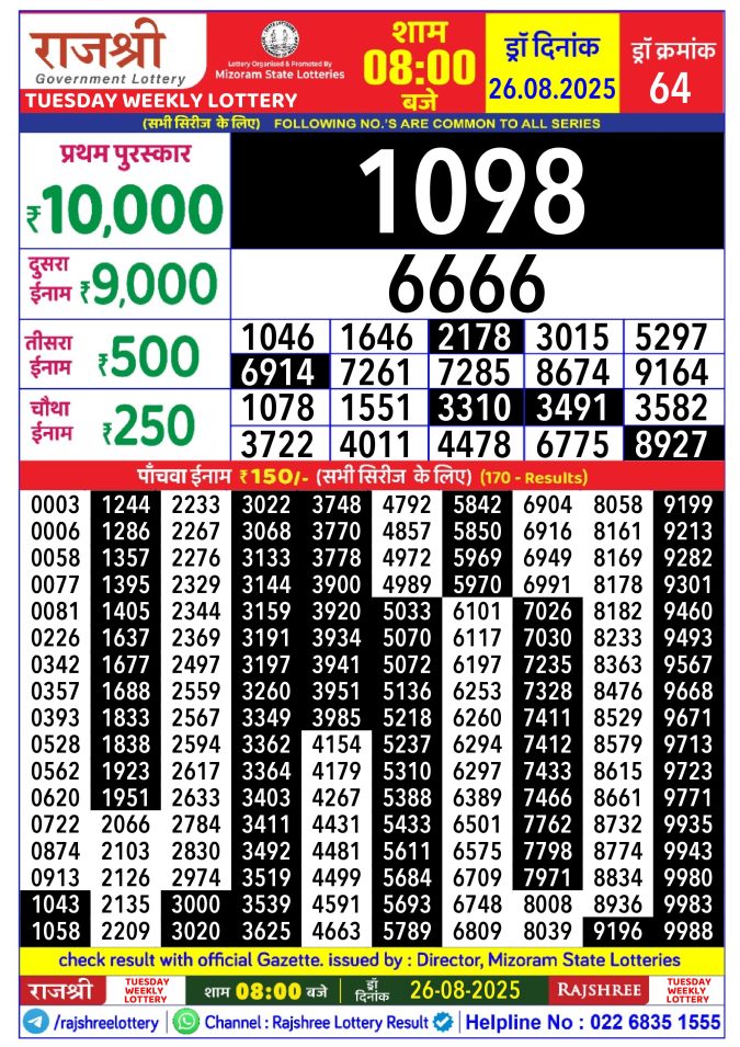 Rajshree Tuesday 8pm Weekly Lottery Result 26/08/2025