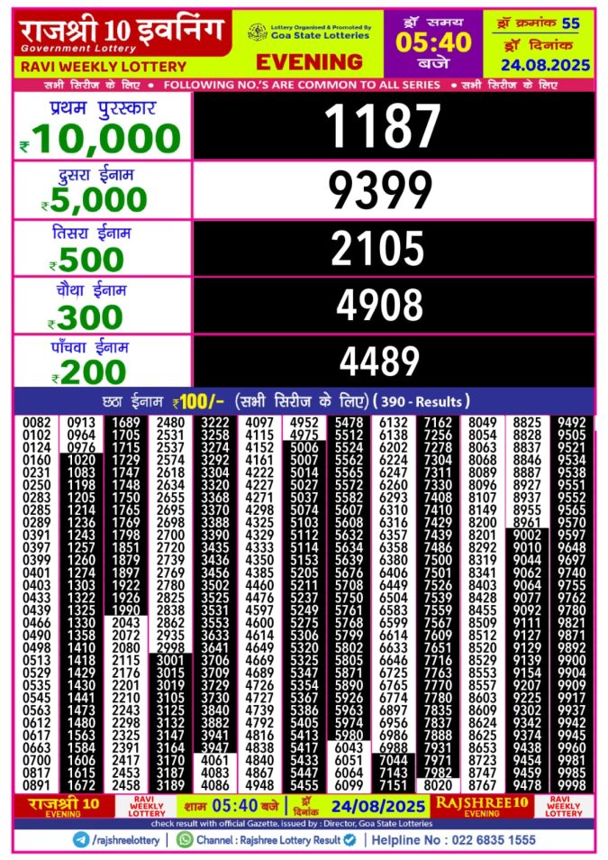 Rajshree 10 Evening Ravi Weekly Lottery Result 5.40pm 24/08/2025