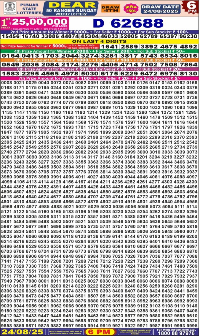 Punjab State Dear50 6pm Sunday Weekly Lottery Result 24/08/2025