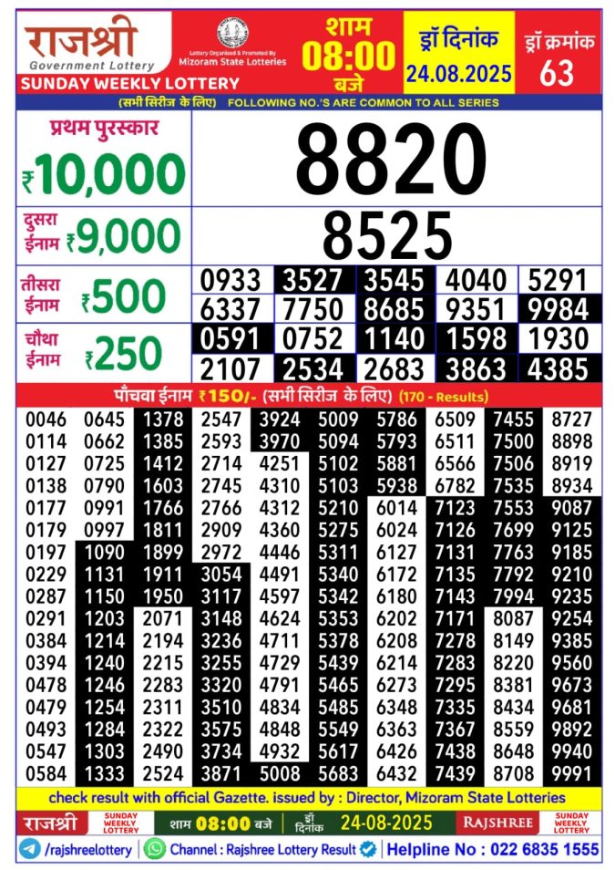 Rajshree Ravi 1pm Weekly Lottery Result 24/08/2025