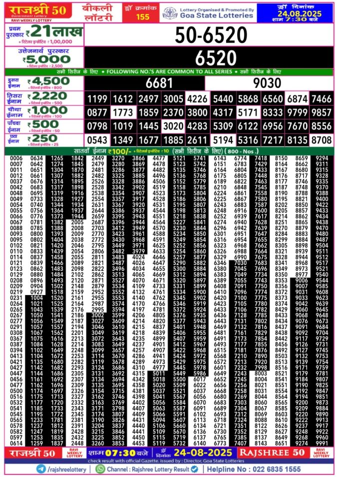 Rajshree 50 Ravi Weekly Lottery Result 7.30pm 24/08/2025
