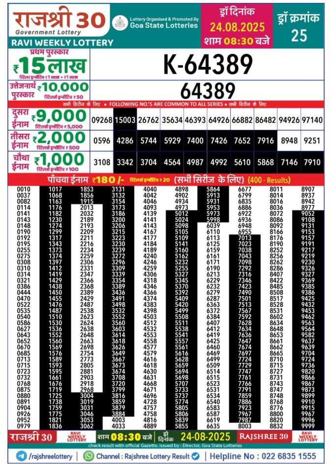 Rajshree 30 Ravi Weekly Lottery Result 8.30pm 24/08/2025