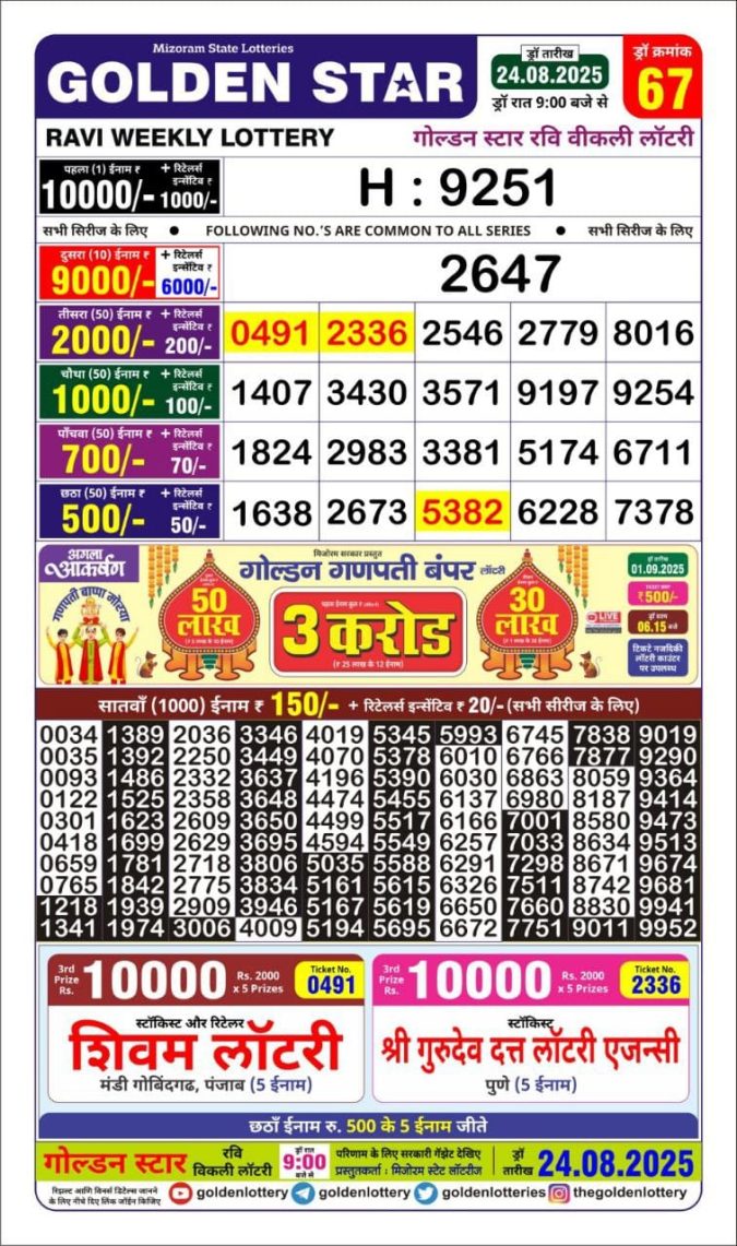 Golden Star Ravi 9pm Weekly Lottery Result 24/08/2025