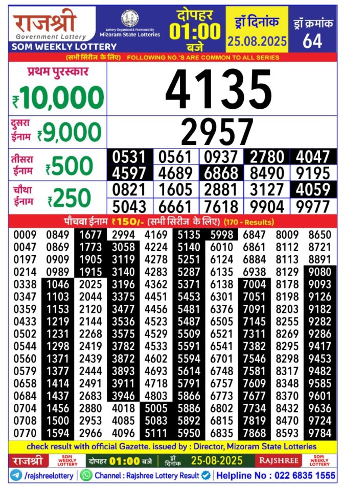 Rajshree Som 1pm Weekly Lottery Result 25/08/2025