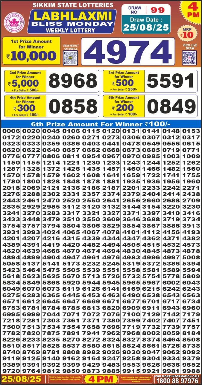 Labh Laxmi Bliss 4pm Monday Weekly Lottery Result 25/08/2025