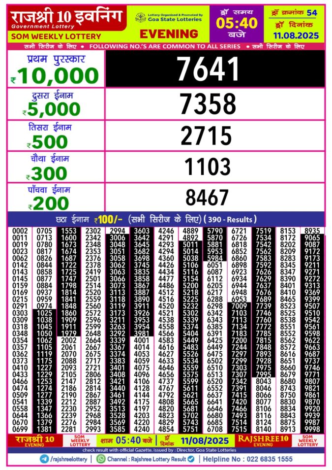 Rajshree 10 Evening Som Weekly Lottery Result 5.40pm 11/08/2025