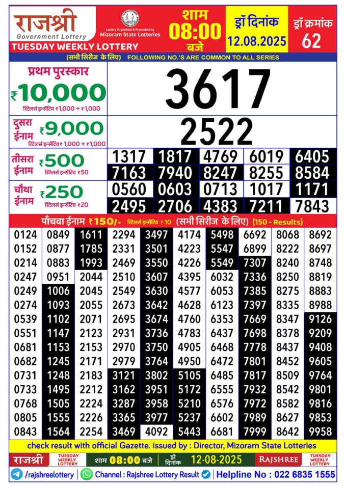 Rajshree Mangal 1pm Weekly Lottery Result 12/08/2025