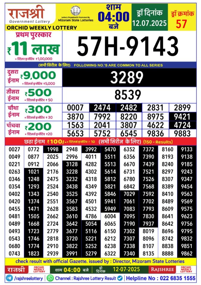 Rajshree Orchid 4PM Weekly Lottery Result 12/07/2025
