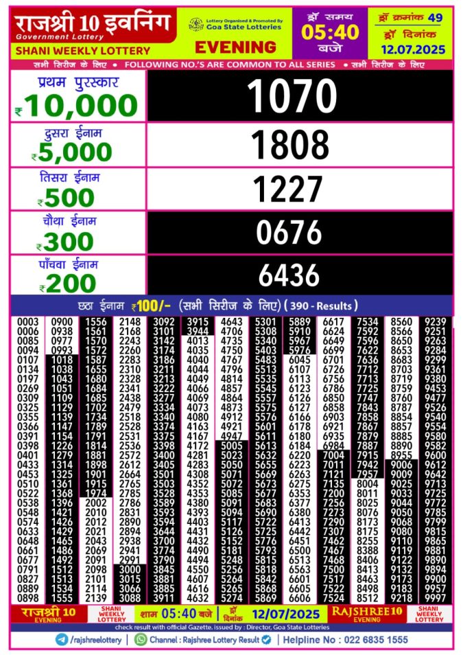 Rajshree Shani 1PM Weekly Lottery Result 12/07/2025