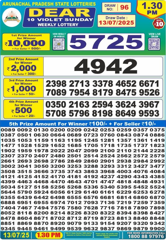 Dear Yumana 1PM Sunday Weekly Lottery Result 13/07/2025