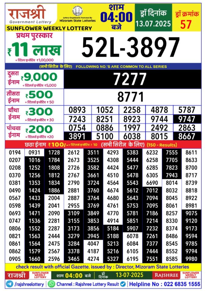 Rajshree Sunflower 4PM Weekly Lottery Result 13/07/2025