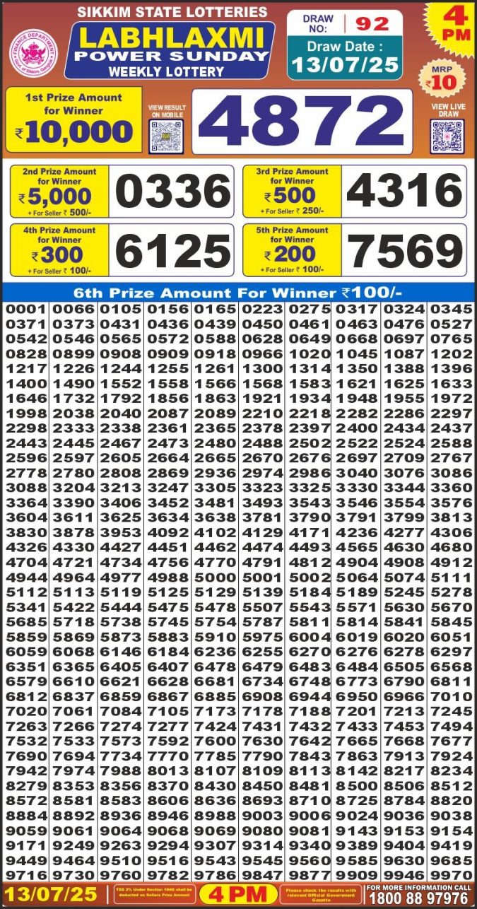 Labh Laxmi Power 4PM Sunday Weekly Lottery Result 13/07/2025