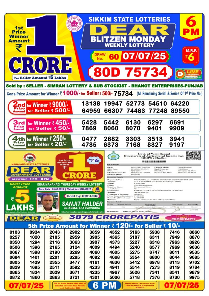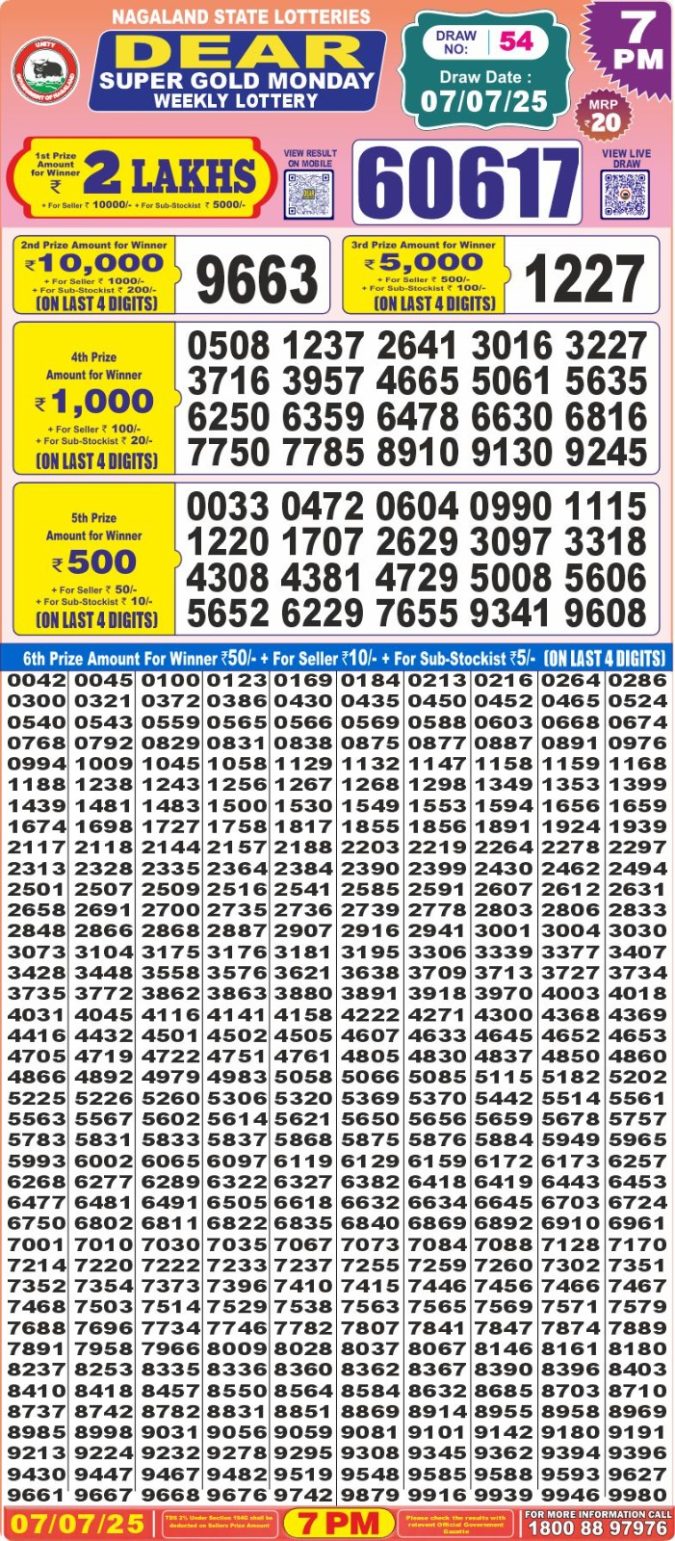Dear super gold 7pm Monday weekly lottery result 07/07/2025