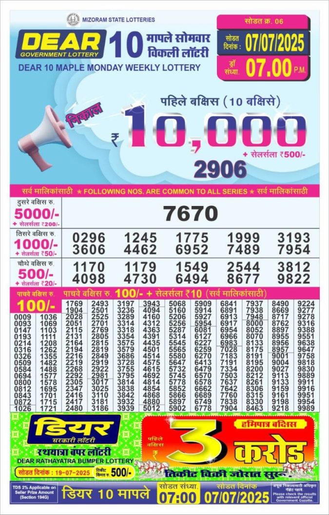 Dear 10 7pm Monday weekly lottery result 07/07/2025