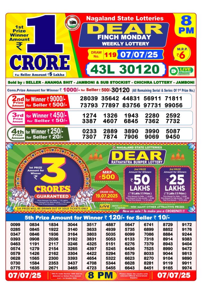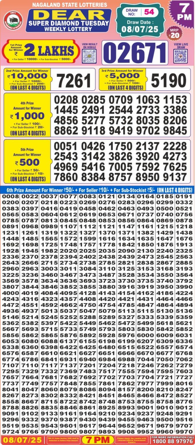 Dear super diamond 7pm Monday weekly lottery result 08/07/2025