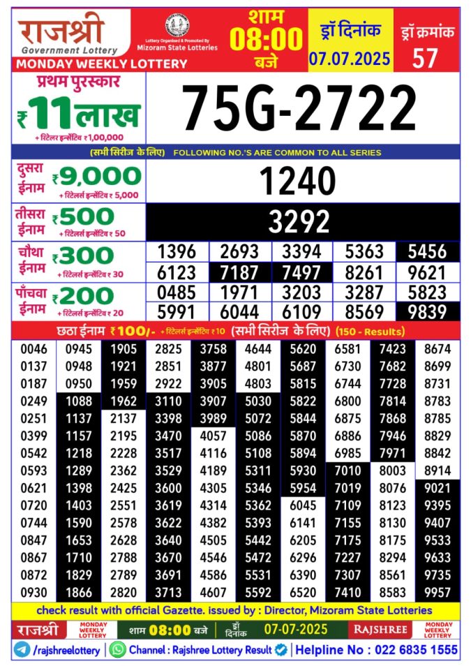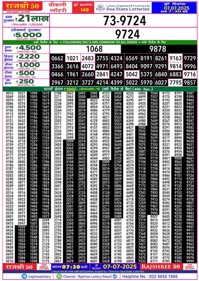 Rajshree 50 som 7.30pm weekly lottery result 07/07/2025