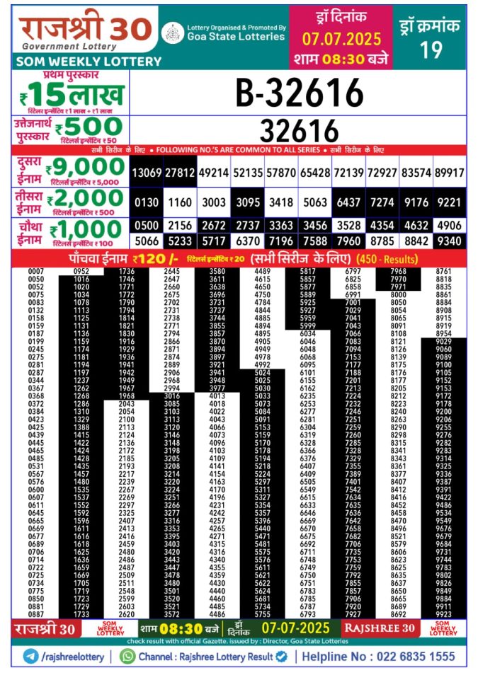 Rajshree 30 som 8.30 weekly lottery result 07/07/2025