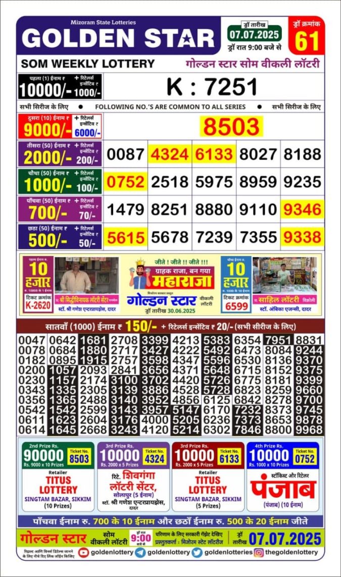 Golden star lottery result Today 9pm 07/07/2025