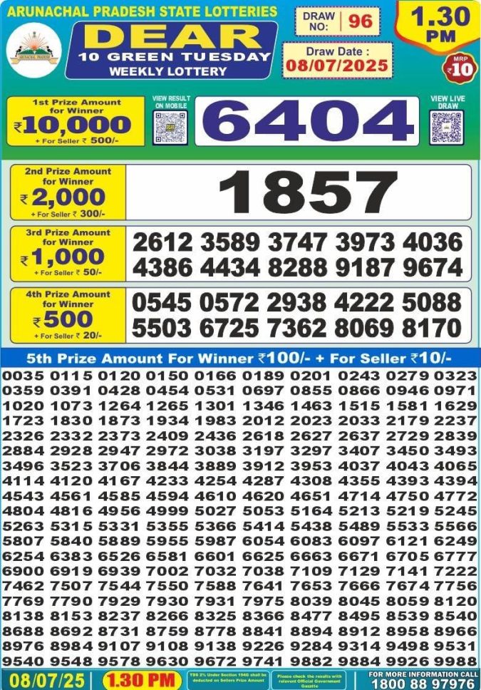 Dear 10 green 1.30pm Tuesday weekly lottery result 08/07/2025