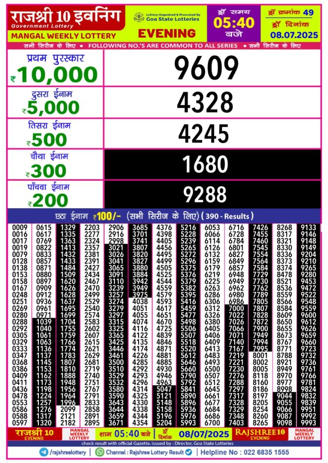 Rajshree 10 evening mangal 5.40pm weekly lottery result 08/07/2025