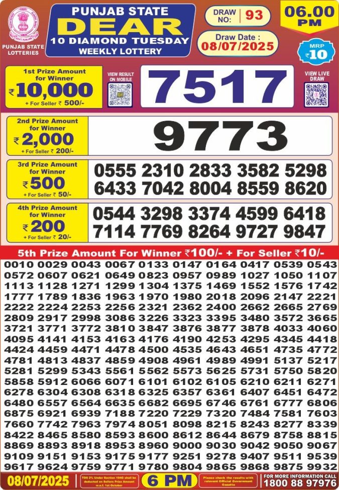 Punjab state dear10 6pm Tuesday weekly lottery result 08/07/2025