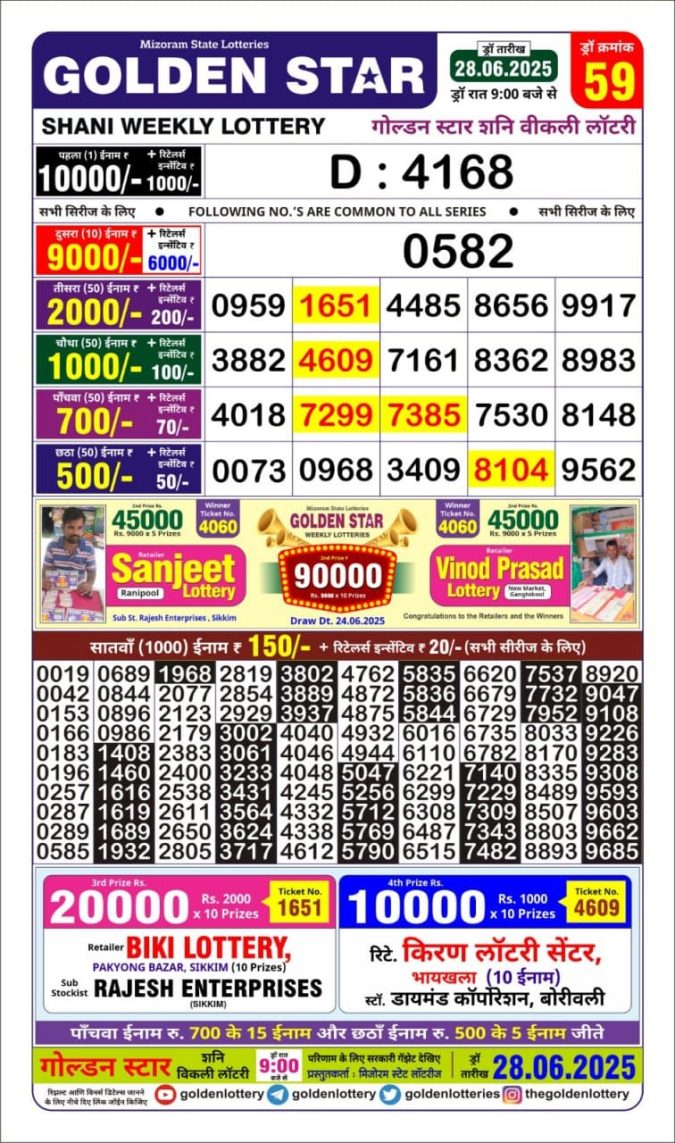 Golden star shani 9pm weekly lottery result 28/06/2025