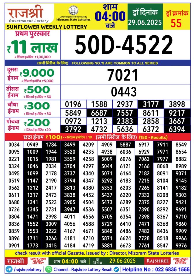 Rajshree sunflower 4pm weekly lottery result 29/06/2025