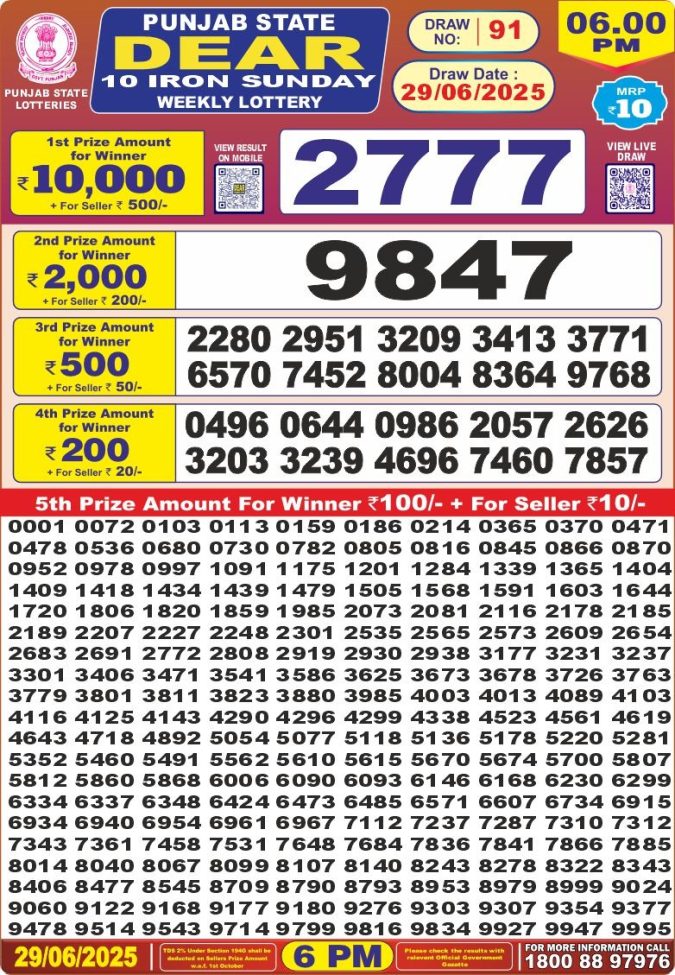 Punjab state dear10 6pm sunday weekly lottery result 29/06/2025