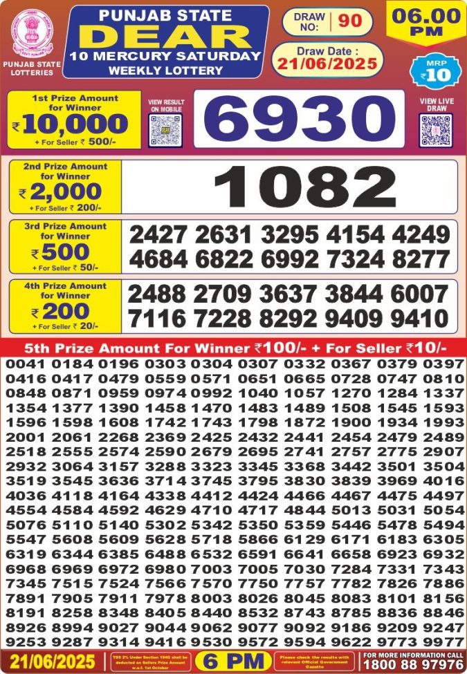 Punjab State Dear Summer Special Bumper Lottery Result 21/06/2025