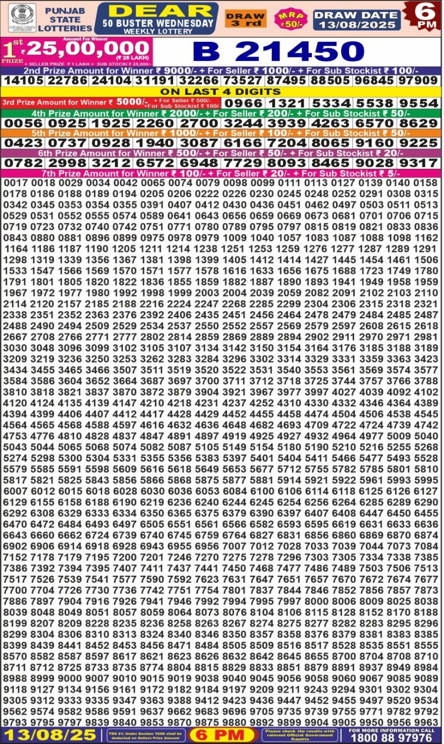 Punjab State Dear 50 6pm Wednesday Weekly Lottery Result 13/08/2025 August 13, 2025 Leave a Comment on Punjab State Dear 50 6pm Wednesday Weekly Lottery Result 13/08/2025 Related Results Punjab State Dear 50 6pm Saturday Weekly Lottery Result 06/12/2025 Punjab State Dear 50 Friday Weekly Lottery Result, 6pm, 05/12/2025 Punjab State Dear 50 6pm Thursday Weekly Lottery Result 04/12/2025 Punjab State Dear 50 6pm Wednesday Weekly Lottery Result 03/12/2025