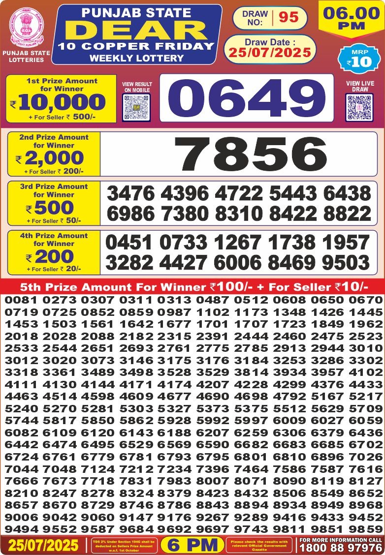 Punjab State Dear 10 Friday Weekly Lottery Result, 6PM, 25/07/2025 July 25, 2025 Leave a Comment on Punjab State Dear 10 Friday Weekly Lottery Result, 6PM, 25/07/2025 Related Results Punjab State Dear 50 Friday Weekly Lottery Result, 6pm, 05/12/2025 Punjab State Dear 50 6pm Thursday Weekly Lottery Result 04/12/2025 Punjab State Dear 50 6pm Wednesday Weekly Lottery Result 03/12/2025 Punjab State Dear 50 6pm Tuesday Weekly Lottery Result 02/12/2025
