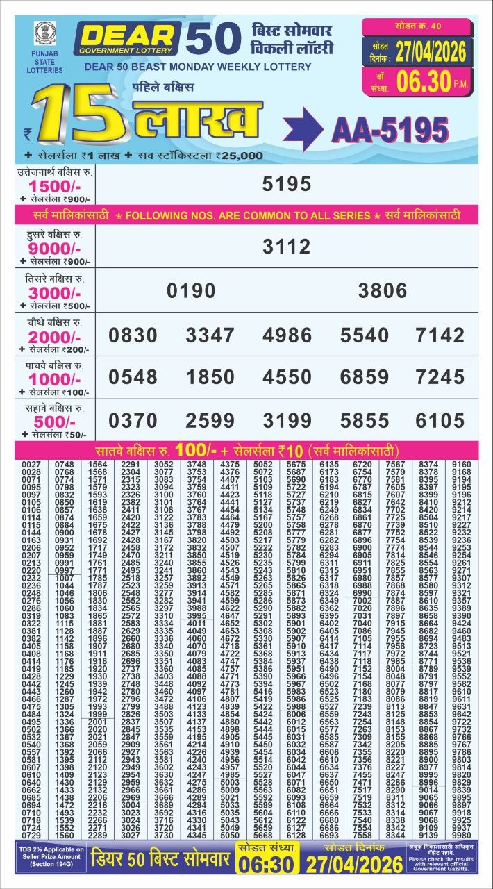 Punjab State Dear 50 6.30pm Monday Weekly Lottery Result 27/04/2026 April 27, 2026 Leave a Comment on Punjab State Dear 50 6.30pm Monday Weekly Lottery Result 27/04/2026 Related Results Punjab State Dear 50 5pm Sunday Weekly Lottery Result 26/04/2026 Punjab State Dear 50 5pm Saturday Weekly Lottery Result 25/04/2026 Punjab State Dear 50 5pm Friday Weekly Lottery Result 24/04/2026 Punjab State Dear 50 5pm Thursday Weekly Lottery Result 23/04/2026