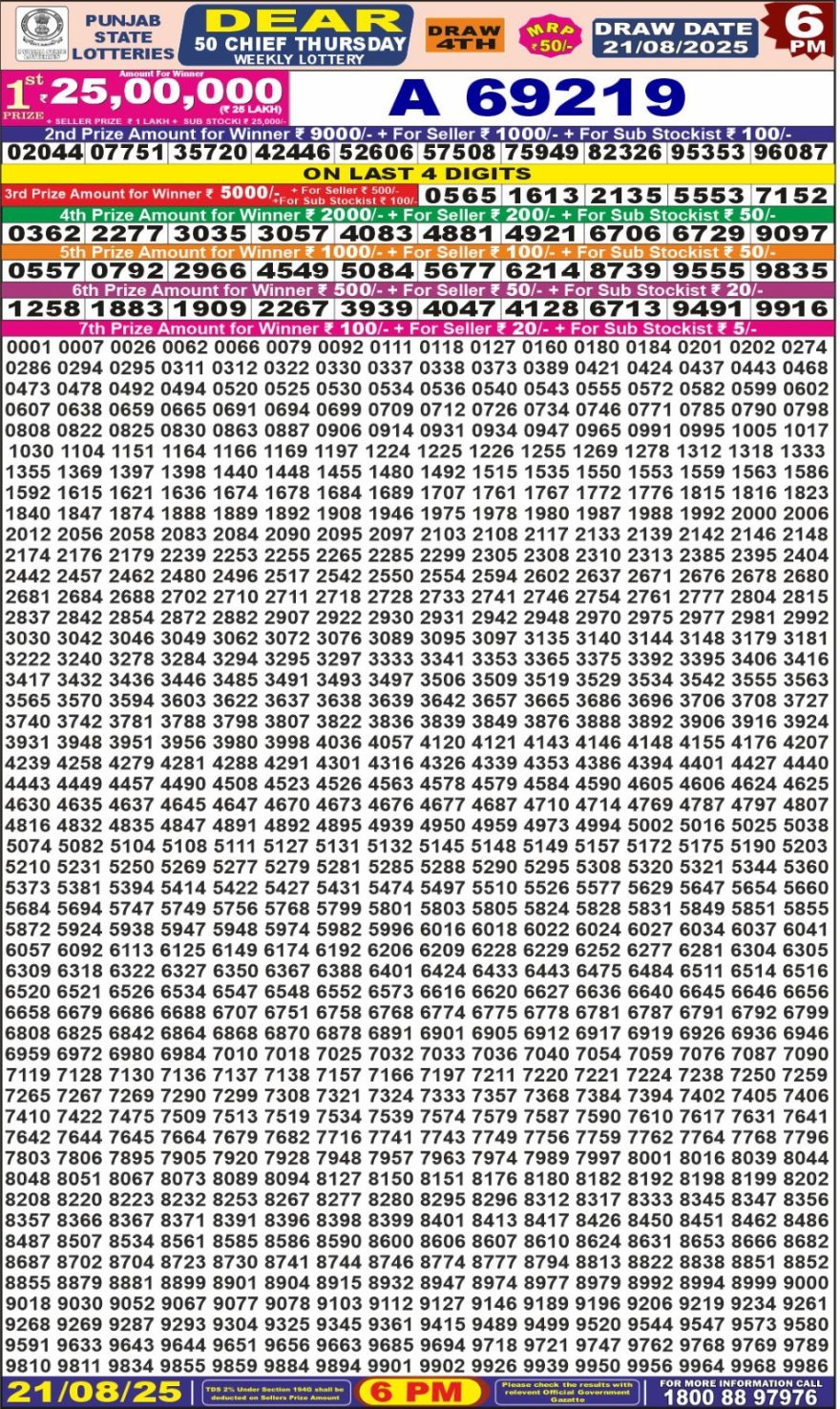 Punjab State Dear 50 6pm Thursday Weekly Lottery Result 21/08/2025 August 21, 2025 Leave a Comment on Punjab State Dear 50 6pm Thursday Weekly Lottery Result 21/08/2025 Related Results Punjab State Dear 50 Friday Weekly Lottery Result, 6pm, 05/12/2025 Punjab State Dear 50 6pm Thursday Weekly Lottery Result 04/12/2025 Punjab State Dear 50 6pm Wednesday Weekly Lottery Result 03/12/2025 Punjab State Dear 50 6pm Tuesday Weekly Lottery Result 02/12/2025