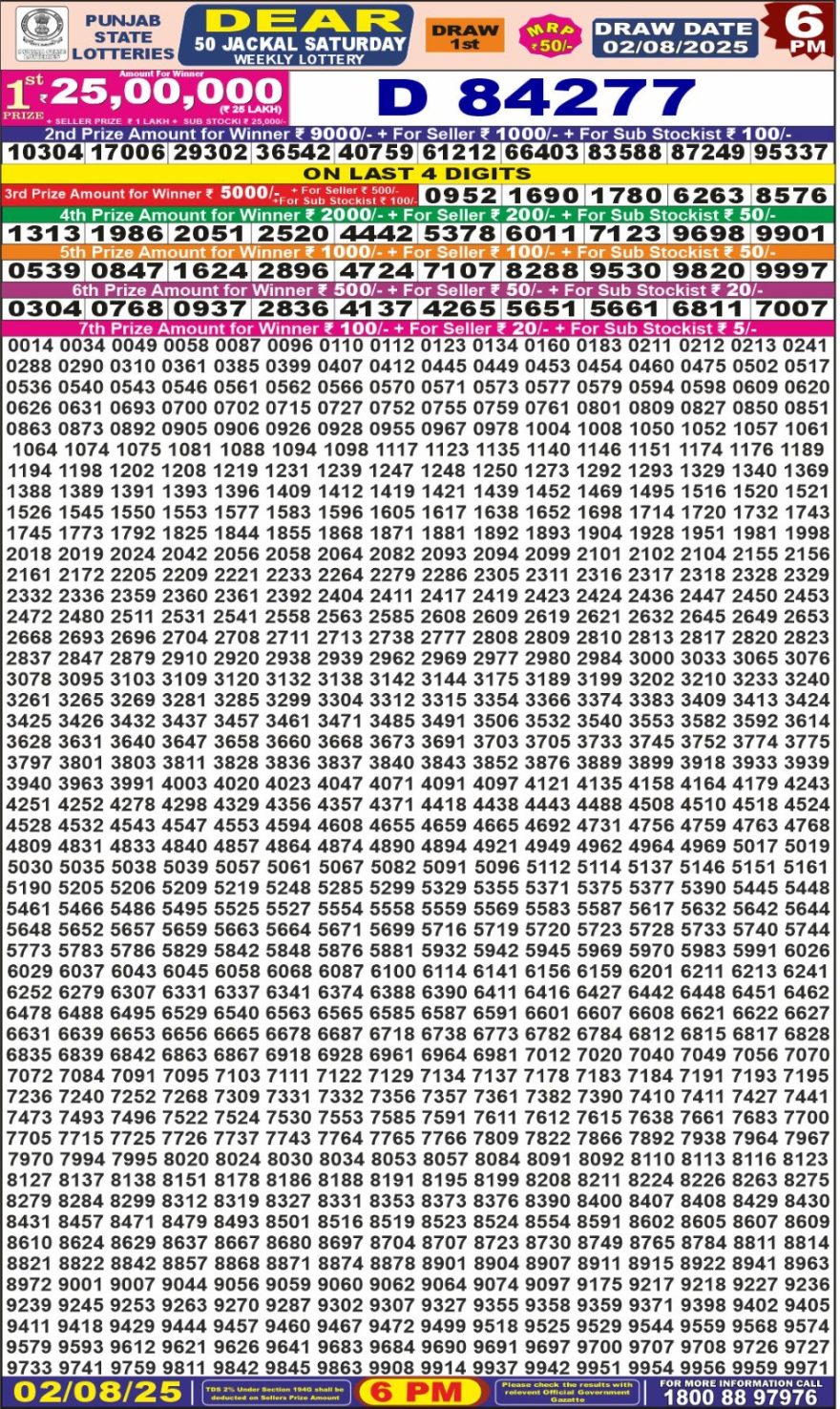 Punjab State Dear50 6pm Saturday Weekly Lottery Result 02/08/2025 August 2, 2025 Leave a Comment on Punjab State Dear50 6pm Saturday Weekly Lottery Result 02/08/2025 Related Results Punjab State Dear 50 6pm Saturday Weekly Lottery Result 13/12/2025 Punjab State Dear 50 Friday Weekly Lottery Result, 6pm, 12/12/2025 Punjab State Dear 50 6pm Thursday Weekly Lottery Result 11/12/2025 Punjab State Dear 50 6pm Wednesday Weekly Lottery Result 10/12/2025