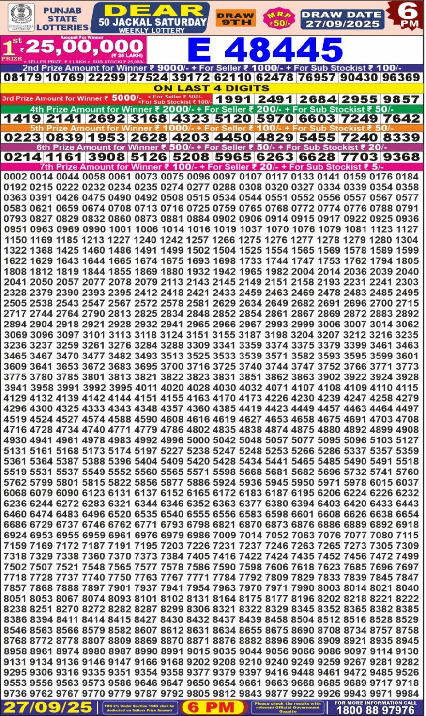 Punjab State Dear50 6pm Saturday Weekly Lottery Result 27/09/2025 September 27, 2025 Leave a Comment on Punjab State Dear50 6pm Saturday Weekly Lottery Result 27/09/2025 Related Results Punjab State Dear 50 6pm Saturday Weekly Lottery Result 06/12/2025 Punjab State Dear 50 Friday Weekly Lottery Result, 6pm, 05/12/2025 Punjab State Dear 50 6pm Thursday Weekly Lottery Result 04/12/2025 Punjab State Dear 50 6pm Wednesday Weekly Lottery Result 03/12/2025