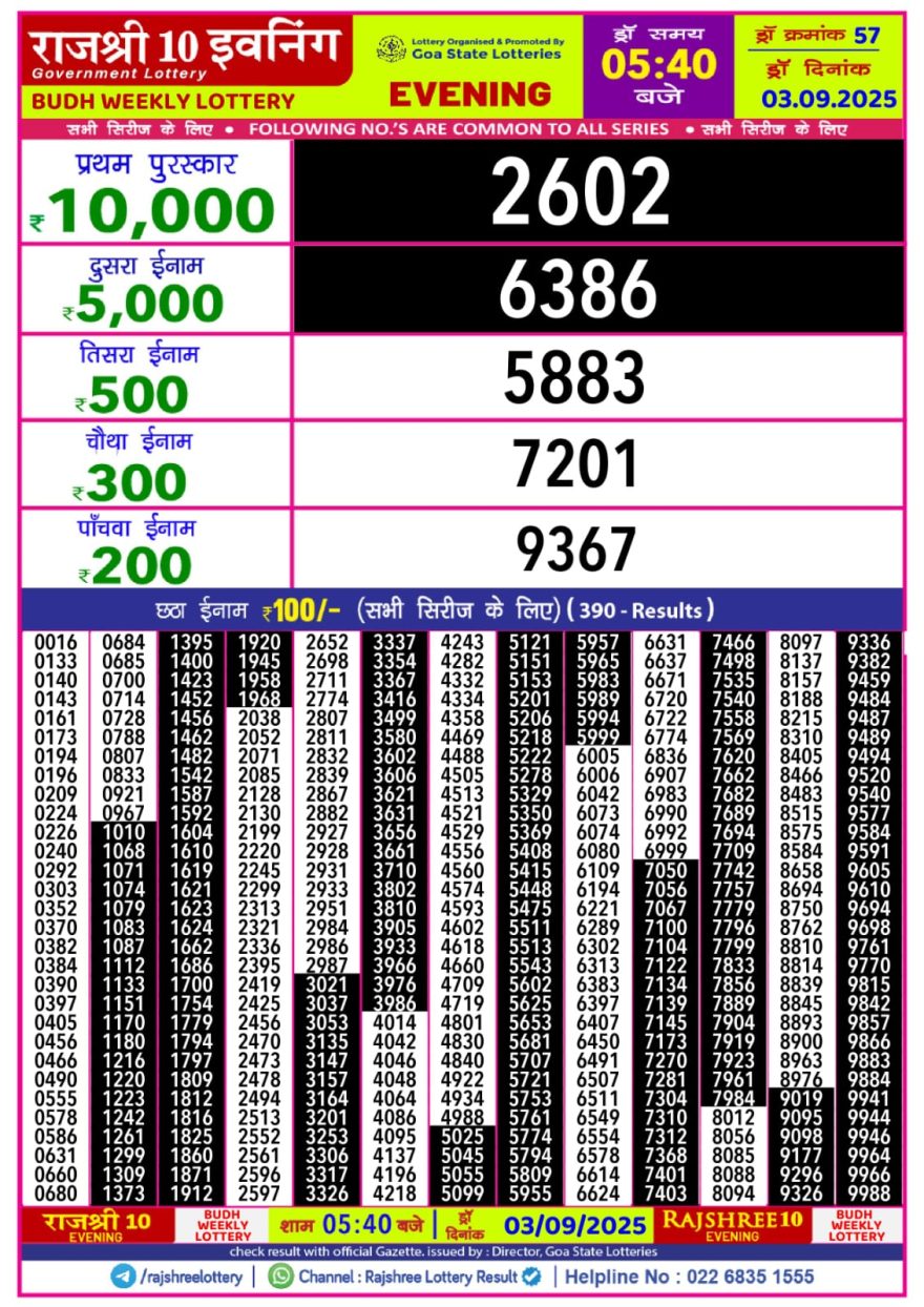 Rajshree 10 Evening Budh Weekly Lottery Result 5.40pm 03/09/2025 September 3, 2025 Leave a Comment on Rajshree 10 Evening Budh Weekly Lottery Result 5.40pm 03/09/2025 Related Results Rajshree 50 Shani Weekly Lottery Result 7.30pm 06/12/2025 Rajshree Saturday 8pm Weekly Lottery Result 06/12/2025 Rajshree 10 Evening Shani 5.40pm Weekly Lottery Result 06/12/2025 Rajshree Orchid 4pm Weekly Lottery Result 06/12/2025