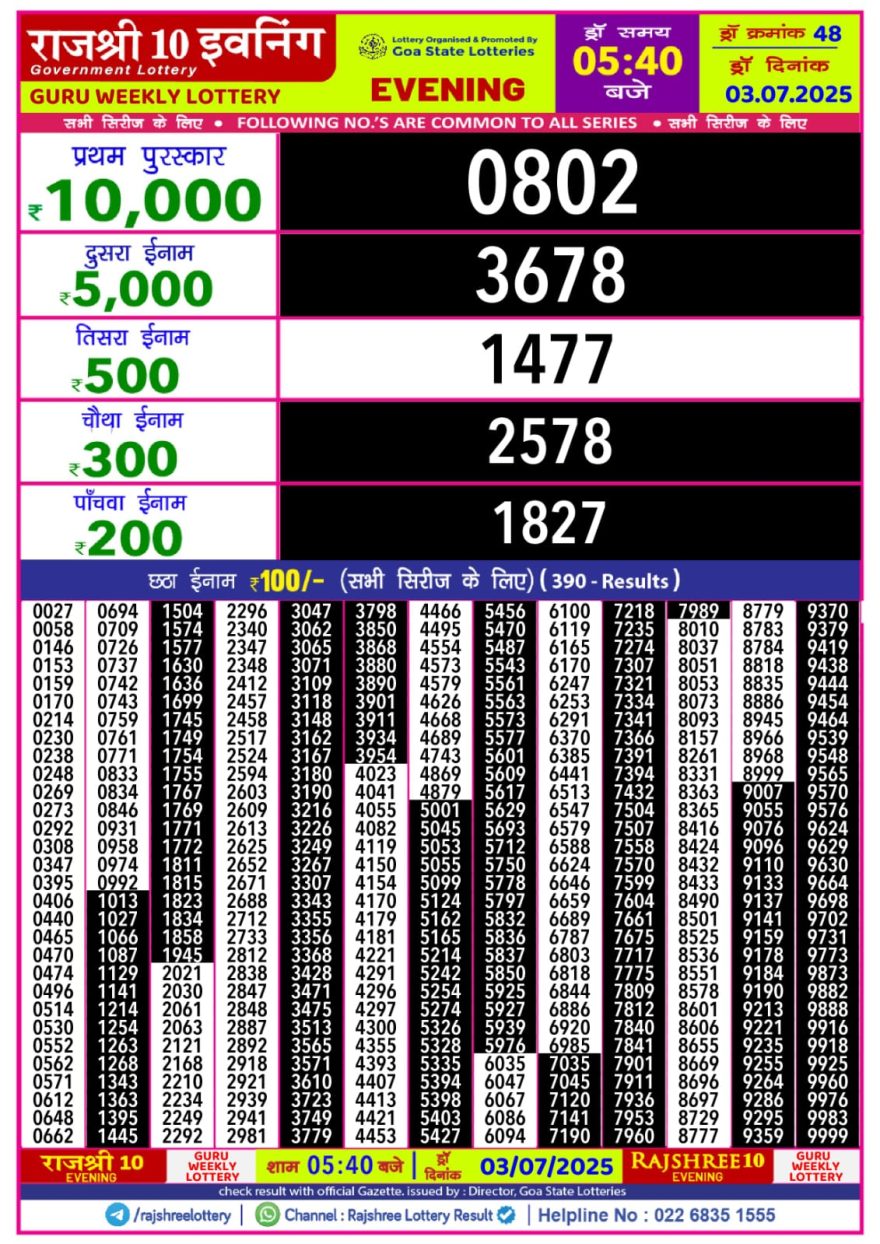 Rajshree 10 evening guru 5.40pm weekly lottery result 03/07/2025 July 3, 2025 Leave a Comment on Rajshree 10 evening guru 5.40pm weekly lottery result 03/07/2025 Related Results Rajshree 50 Shani Weekly Lottery Result 7.30pm 13/12/2025 Rajshree Saturday 8pm Weekly Lottery Result 13/12/2025 Rajshree 10 Evening Shani 5.40pm Weekly Lottery Result 13/12/2025 Rajshree Orchid 4pm Weekly Lottery Result 13/12/2025