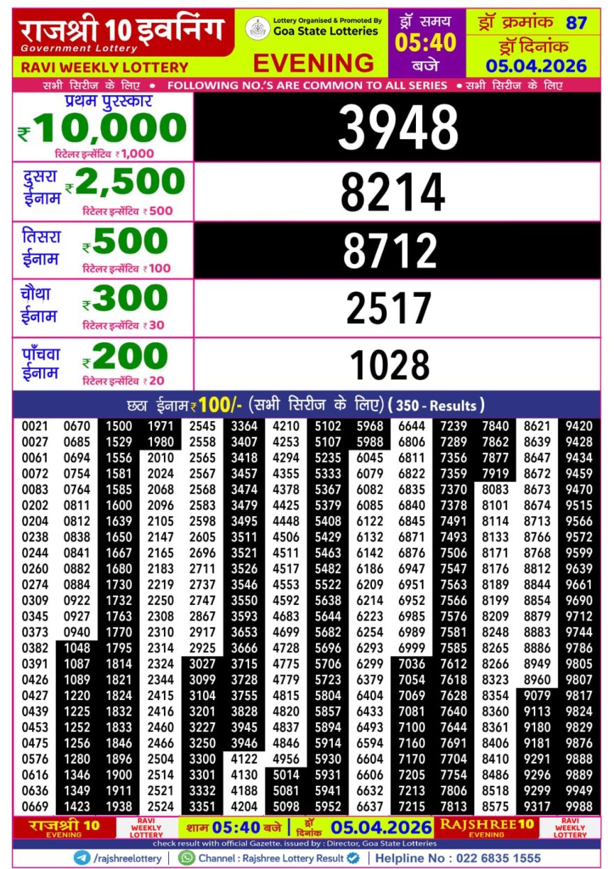 Rajshree 10 Evening Ravi Weekly Lottery Result 5.40pm 05/04/2026 April 5, 2026 Leave a Comment on Rajshree 10 Evening Ravi Weekly Lottery Result 5.40pm 05/04/2026 Related Results Rajshree 50 Mangal 7.30pm Weekly Lottery Result 21/04/2026 Rajshree Tuesday 8pm Weekly Lottery Result 21/04/2026 Rajshree 10 Evening Mangal 5.40pm Weekly Lottery Result 21/04/2026 Rajshree Tulip 4pm Weekly Lottery Result 21/04/2026