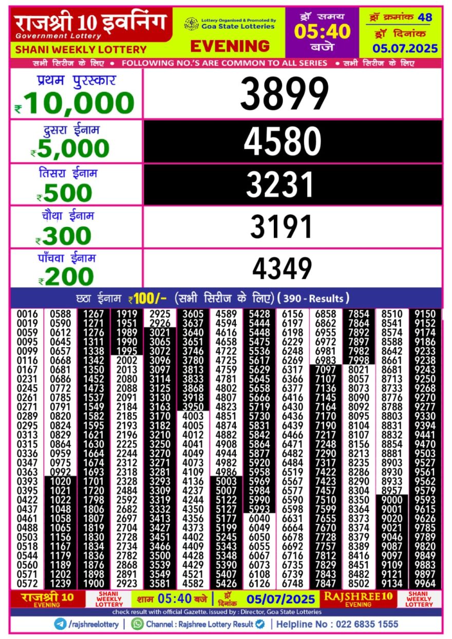 Rajshree 10 evening shani 5.40pm weekly lottery result 05/07/2025 July 5, 2025 Leave a Comment on Rajshree 10 evening shani 5.40pm weekly lottery result 05/07/2025 Related Results Rajshree 50 Shani Weekly Lottery Result 7.30pm 13/12/2025 Rajshree Saturday 8pm Weekly Lottery Result 13/12/2025 Rajshree 10 Evening Shani 5.40pm Weekly Lottery Result 13/12/2025 Rajshree Orchid 4pm Weekly Lottery Result 13/12/2025