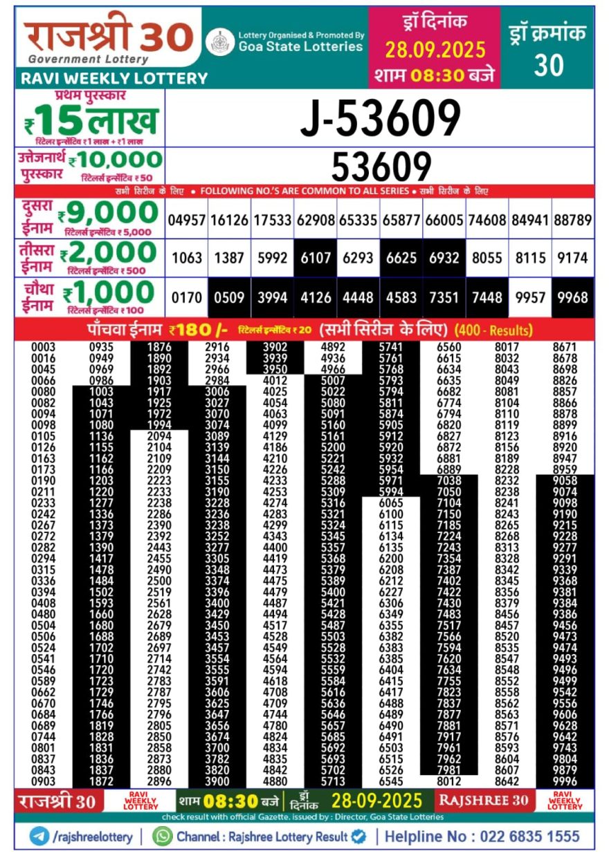 September 28, 2025  Leave a Comment on Rajshree 30 Ravi Weekly Lottery Result 8.30pm 28/09/2025