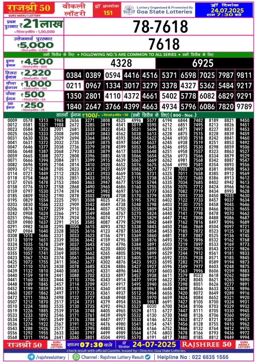 Rajshree 50 Guru 7.30PM Weekly Lottery Result 24/07/2025 July 24, 2025 Leave a Comment on Rajshree 50 Guru 7.30PM Weekly Lottery Result 24/07/2025 Related Results Rajshree 50 Shani Weekly Lottery Result 7.30pm 13/12/2025 Rajshree Saturday 8pm Weekly Lottery Result 13/12/2025 Rajshree 10 Evening Shani 5.40pm Weekly Lottery Result 13/12/2025 Rajshree Orchid 4pm Weekly Lottery Result 13/12/2025