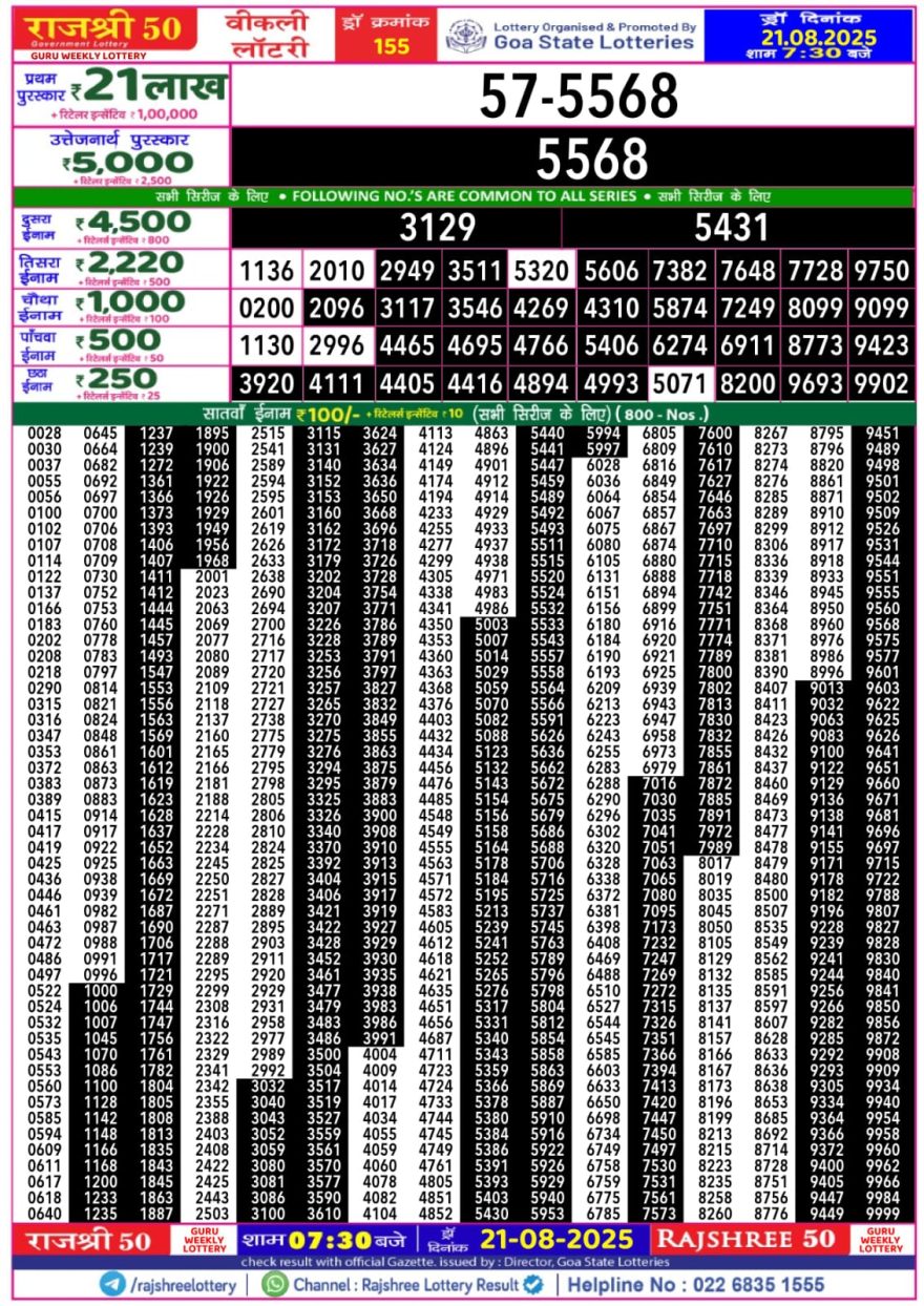 Rajshree 50 Guru Weekly Lottery Result 7.30pm 21/08/2025