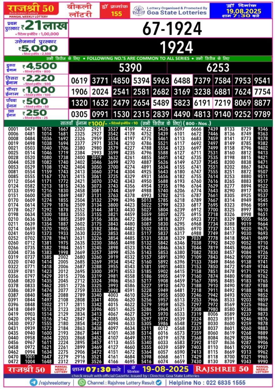 Rajshree 50 Mangal 7.30pm Weekly Lottery Result 19/08/2025