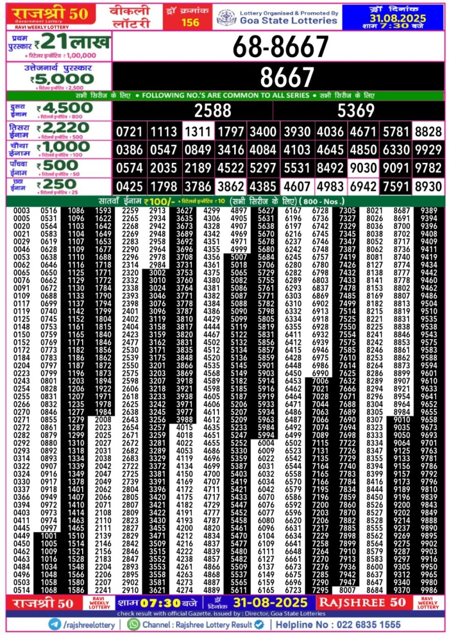 Rajshree 50 Ravi Weekly Lottery Result 7.30pm 31/08/2025 August 31, 2025 Leave a Comment on Rajshree 50 Ravi Weekly Lottery Result 7.30pm 31/08/2025 Related Results Rajshree 50 Shani Weekly Lottery Result 7.30pm 06/12/2025 Rajshree Saturday 8pm Weekly Lottery Result 06/12/2025 Rajshree 10 Evening Shani 5.40pm Weekly Lottery Result 06/12/2025 Rajshree Orchid 4pm Weekly Lottery Result 06/12/2025